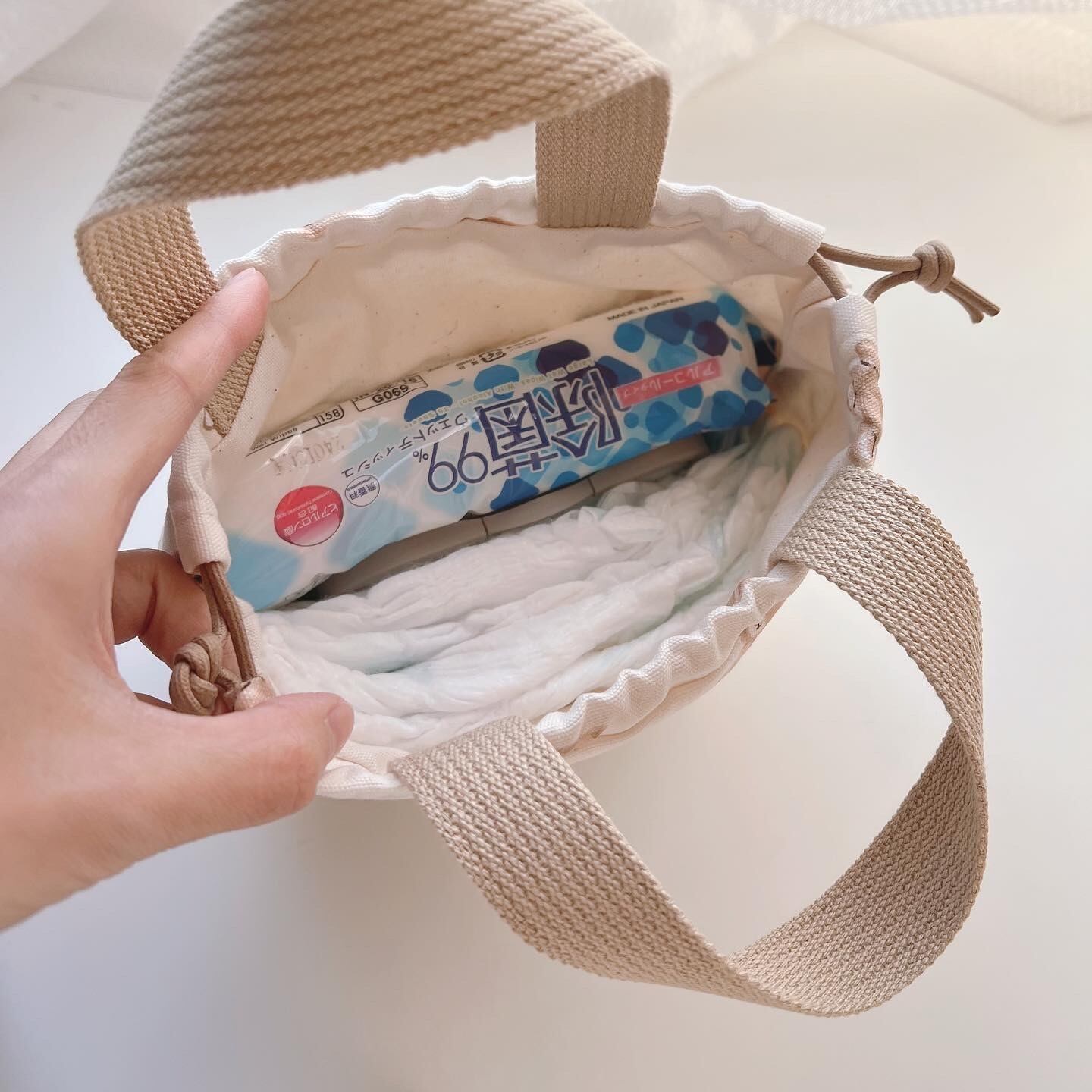 2つ折りのお財布、スマホ、エコバッグ、ハンカチ、ティッシュが入る小さめバッグです。